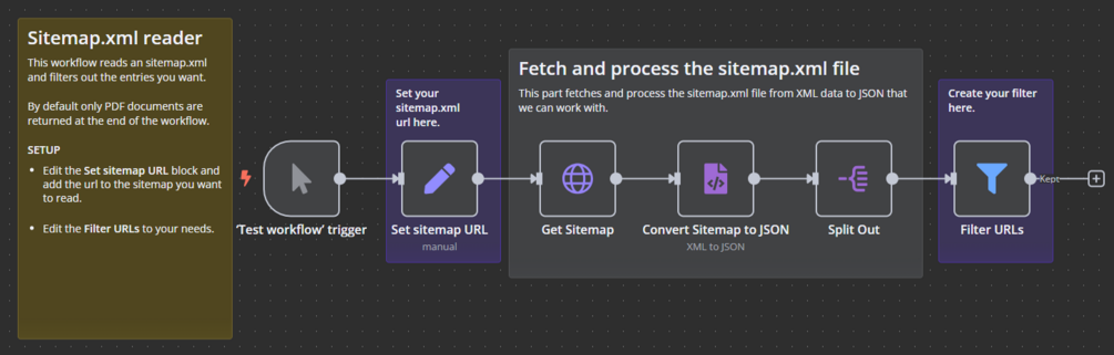 This workflow reads a sitemap.xml file, extracts all URLs, and allows you to filter out specific types of links—such as PDF files, images, or any other content—based on your needs.